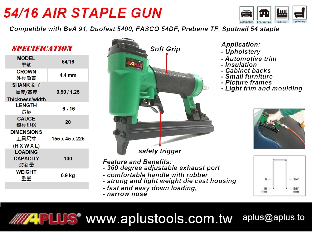 APLUS 5414-5040 ,20-gauge divergent point staples, primarily for securing carpet and padding, but also for upholstery, roofing felt, and building paper