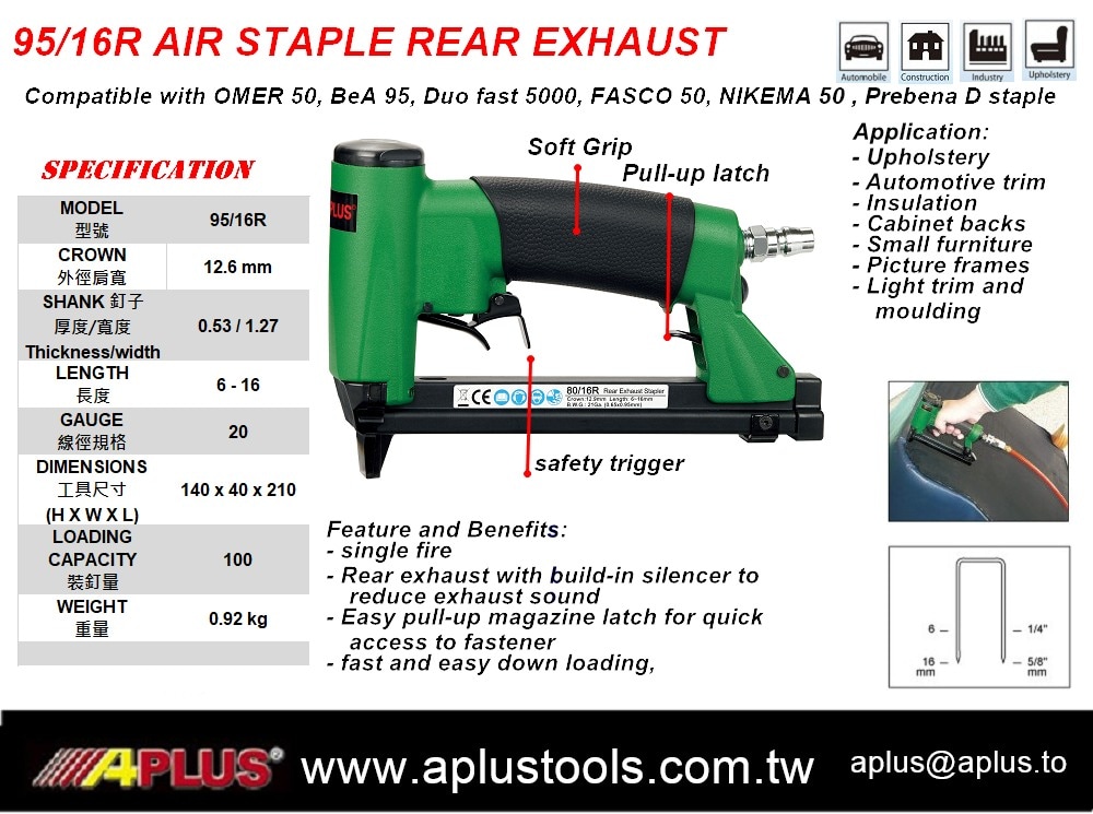 APLUS 95/16R, AIR STAPLE GUN, 95 staple staple 12.6mm crown, 0.53x1.27mm, double trigger FOR SAFETY